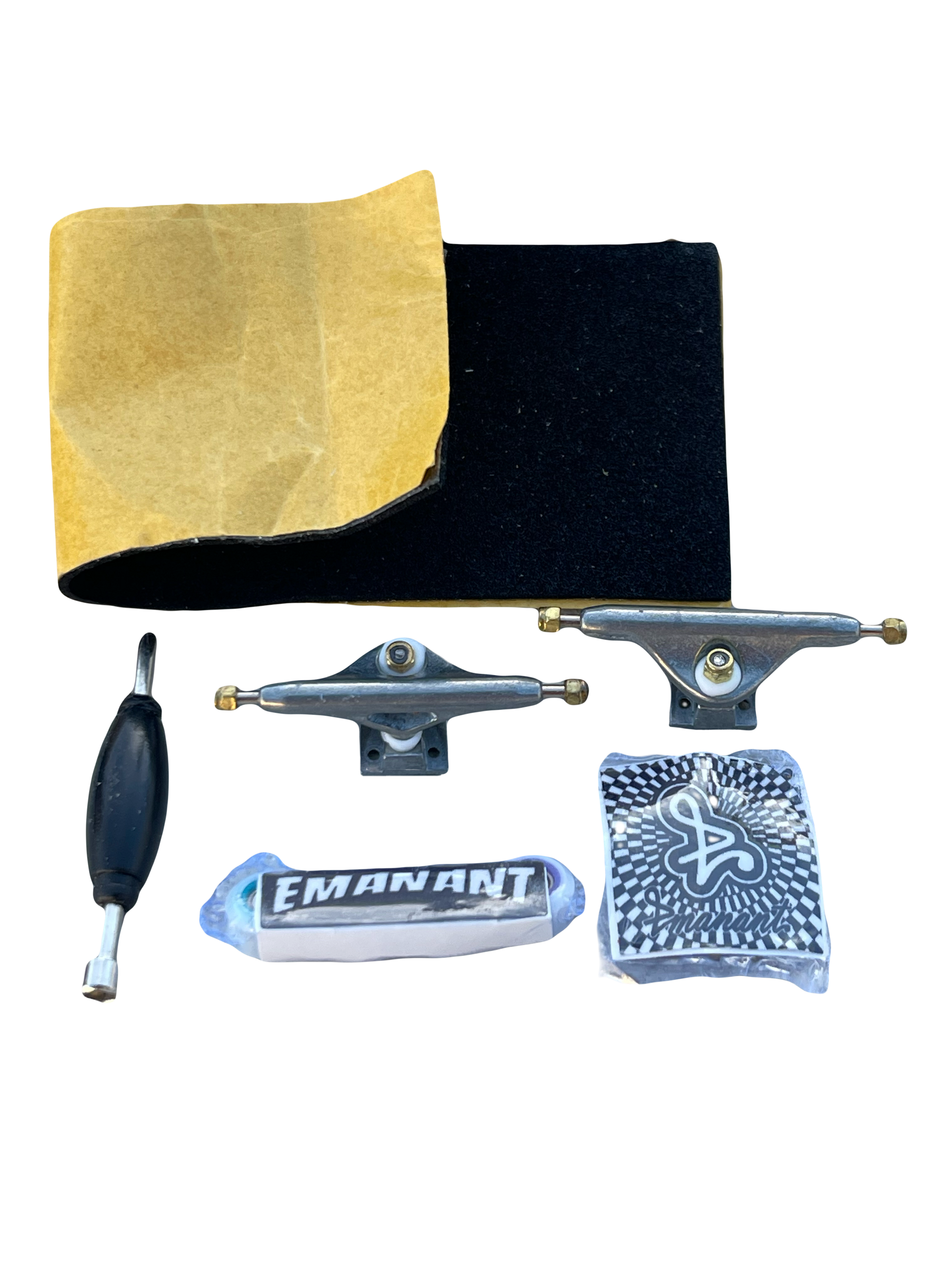No Deck Included. Trucks, Urethane Bearing Wheels, Tool, Screws, and Sticker Pack!